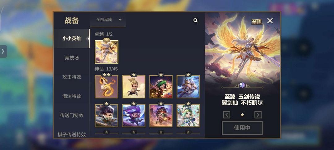 装备描述:至臻大天使神龙亚瑟1个至尊14个神话25英雄230传说9传说棋盘喜欢本账号请点 ☆收藏☆ 方便下次租用,谢谢光临惠顾!