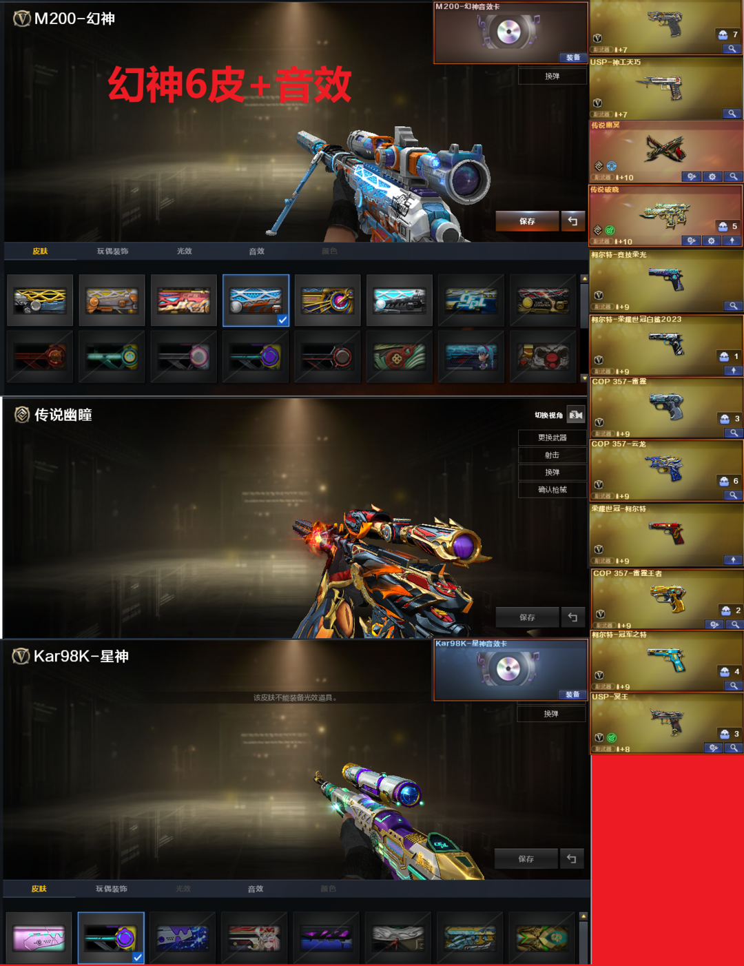 装备描述:排位:可以、、、、、、、、、、、爆破四防:幻神6皮+音效(23白鲨、幻神-Heartshot皮肤、星火小队、2022、周瑜、黄忠皮肤)、传说幽瞳、98K星神、王者星霆、M200-竞技荣光、、、、、传说破晓、传说幽冥、USP冥王、USP雷暴、USP神工天巧、COP雷霆、柯尔特竞技荣光、23白鲨柯尔特、COP云龙、COP雷霆王者、冠军之特、世冠柯尔特、、、、、G36幻影、传说辉光、白虎、QBZ云龙、八面凌龙、QBZ金色蔷薇、王者白虎、王者蔷薇、炽芒蝶刃、、、幻神音效、星神音效、蔷薇音效、天罚音效、雷神音效、毁灭音效、极光音效、黑骑士音效、、、2套雷霆、1套雷暴、1套堕天神、1套夜魔、1套电竞装甲、1套幻灵、7套竞技荣光、1套神工天巧、1套云龙、3套雷霆王者、、、、爆破四防(云悠悠、关小雨、王者貂蝉、王者炽天使、王者涂鸦、王者炫、职业经理、隼).
