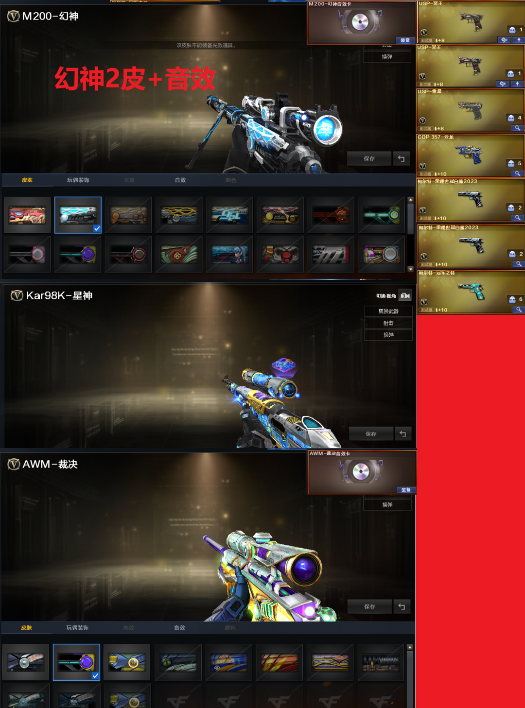 装备描述:排位:可以------------生化四防极品(可以变更背包、查看生化僵尸血量)无需换弹、5烈龙5盘龙、斯太尔蝴蝶、毒蜂、异变清道夫、VPER-12-宙斯、异变镇魔者、死亡之眼、MAC-涂鸦、3把炽芒蝶刃、手斧镜、4个生化减速雷、超级对讲机、、、、、、、、、、、爆破四防全装:幻神2皮+音效(23白鲨、2022皮肤)98K星神、、、、、2把USP冥王、COP云龙、2个23白鲨柯尔特、冠军之特、、、、、FAMAS G2-天戎、传说夜影、G36幻影、白虎、QBZ金色蔷薇、、、、幻神音效、裁决音效、蔷薇音效、、、3套玄豹、1套云龙、1套雷霆王者、、、生化四防(传说影煞、电竞少女)、爆破四防(传说星骇、荒漠琉璃、王者国色天香、荆棘、玄豹)