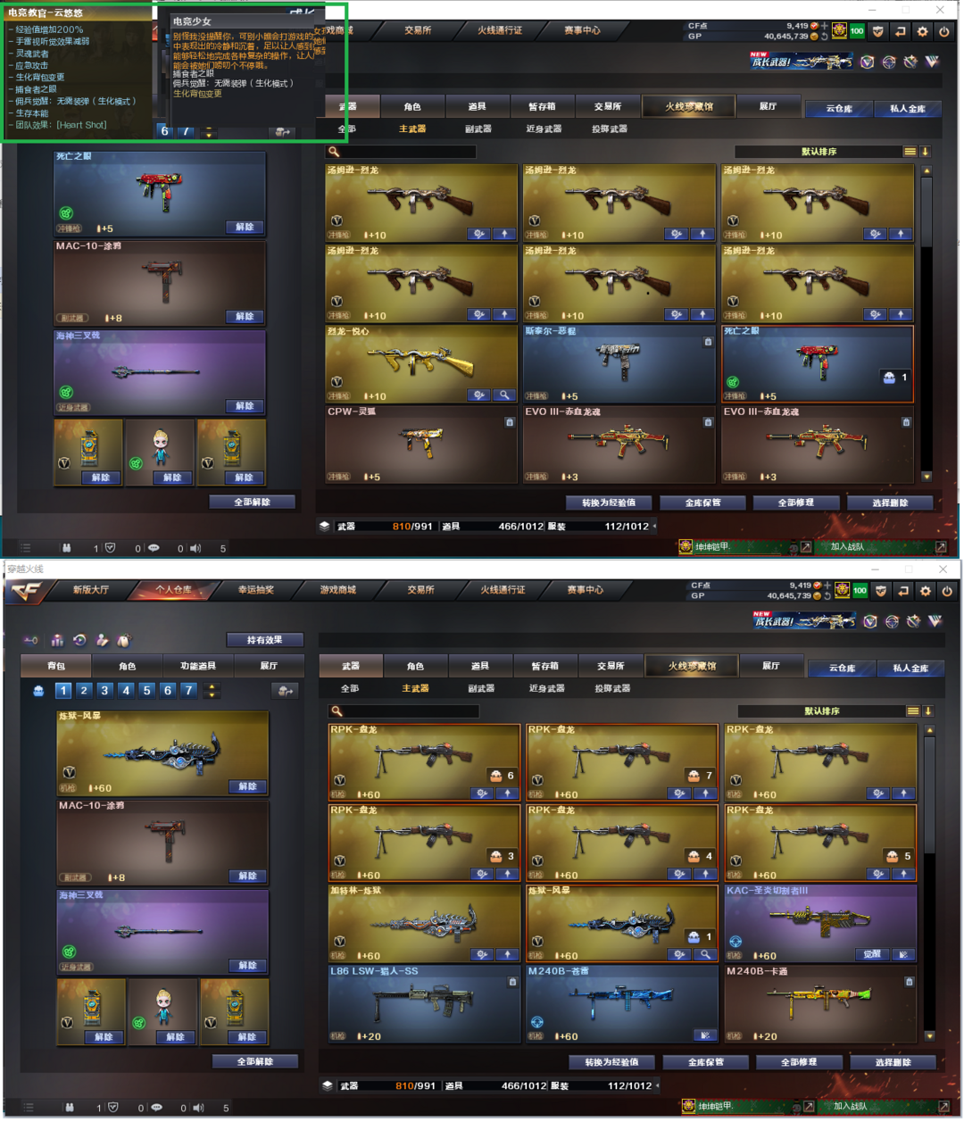 装备描述:排位:可以------------------生化四防:(生化背包、可以查看生化僵尸血量):无需换弹、6烈龙、6盘龙、炼狱、传说灵眸、死亡之眼、MAC-涂鸦、生化减速雷、超级对讲机、全部弹匣、、、、、爆破四防:传说幻神、幻神音效(宠儿、白鲨、冠军之幻)、2个COP雷霆王者、2个柯尔特竞技荣光、白虎、王者芳薇、王者幻神(已觉醒)、、、、幻神音效、蔷薇音效、毁灭音效、黑骑士音效、、、1套雷霆、2套雷暴、1套幻灵、1套竞技荣光、2套雷霆王者、、、生化四防(云悠悠、电竞少女)、爆破四防(传说艾莉莎、王者潘多拉)
