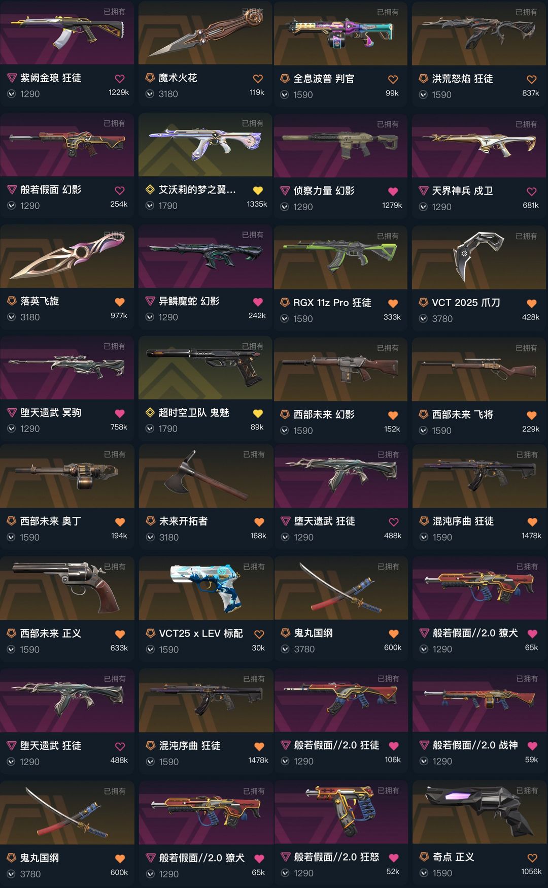 可排✨魔术火花电工钳✨vct爪刀太刀落英飞旋✨紫金猫猫梦之翼洪荒显卡弃王混沌狂徒✨般若侦查力量✨
