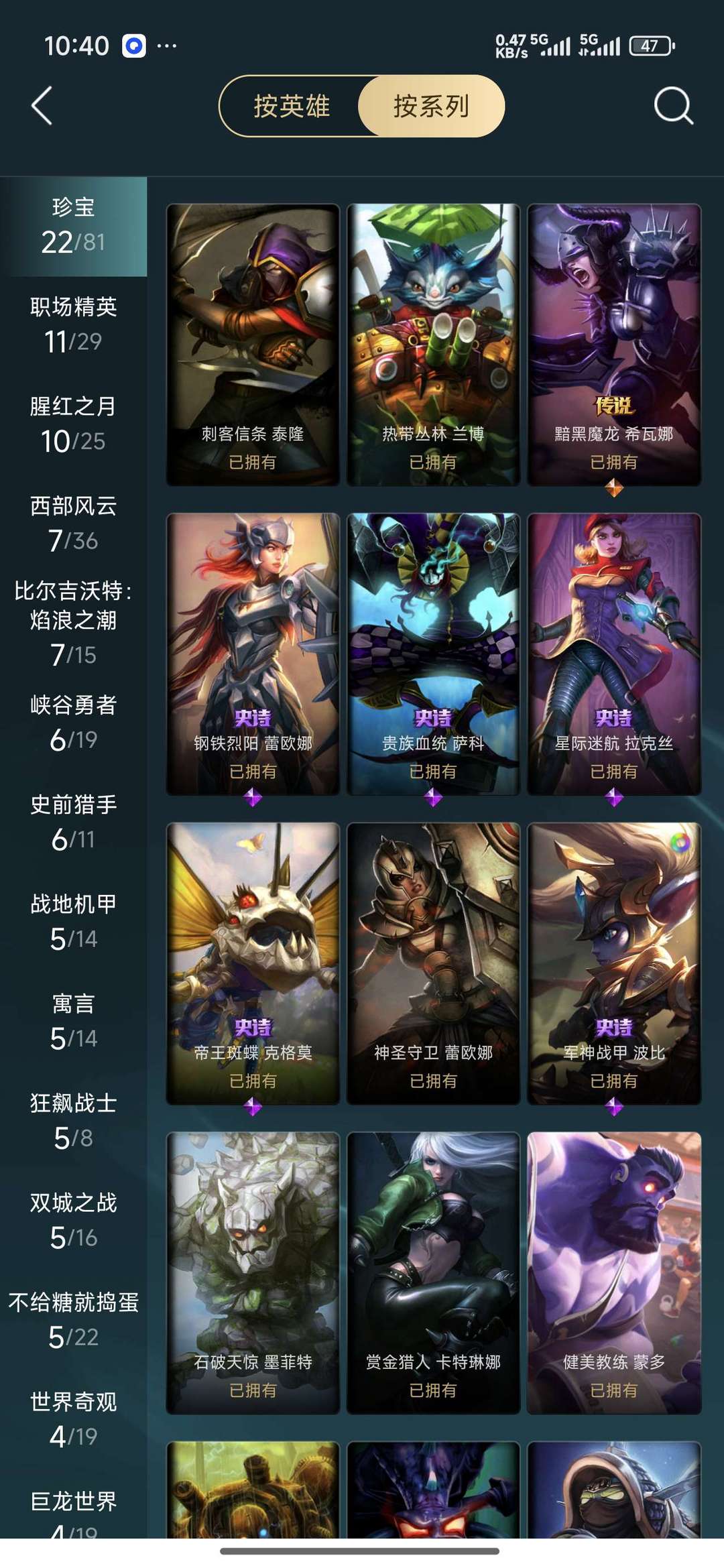 装备描述:个人喜欢玩小丑,相对皮肤多一些,主流皮肤基本有,神王诺手,暗星锤石,暗星皇子等等,可排位,不可挂机