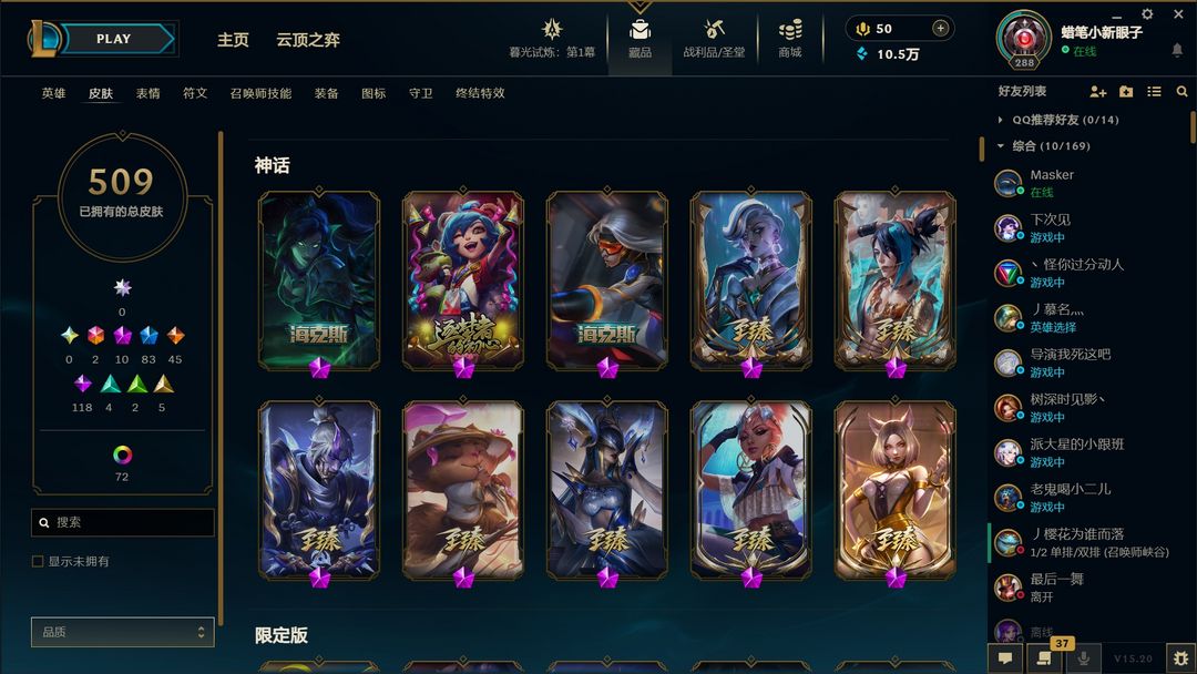 装备描述:自己看吧,排位随便打,单双超凡大师,500+皮肤
