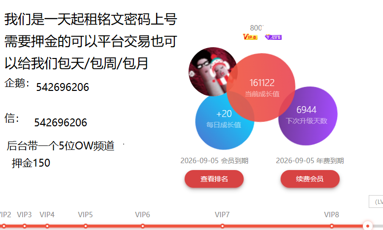 限制: 租号30次及以上 | 撤单率<25%才可租用此帐号装备描述:我们一天起租需Q/【歪歪号码出租规则】 1、家人靠着这个号每天买个馒头,请爹们善待,多谢 2、不准在公屏发言,诈.骗等不良信息,以防出现违规冻结 3、不得进行违规行为,包括进入色ID、网络电话等非法频道, 4、不允许隐身,不可删除、拉黑好友。 5、因爵位号的 宝贵性 租号者 无权利 YY隐身隐藏频道、 如果违反了以上条款中任意一条 号主 则有权利 强制登陆 修改帐号密码 ,并终止出租协议,并且不返还出租金以及押金。 【★声明:以下两点不予撤单★】 ❶某某ID被封,理由:ID被封是某某频道皇马及以上人员封的,非官方封禁,不影响进入其他频道,且一个频道可以有无限个皇马,有作弊嫌疑,非账号本身问题,不予撤单(可以用小号进入频道找皇马解封)。 ❷加好友需要验.证,理由:歪歪加好友出现需要验.证是自动出现的,异地登陆加好友需要验.证纯属正常现象,不影响对方加你,是歪歪好友机制问题,且无法核实租客加了几个好友,有作弊嫌疑,非账号本身问题不撤单(可以让客.服找号主提供验.证或者让对方加你)