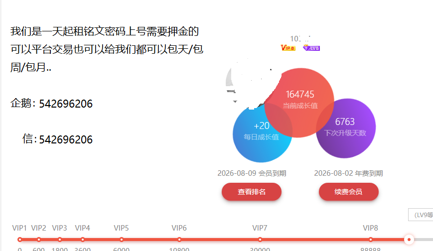限制: 租号30次及以上 | 撤单率<25%才可租用此帐号装备描述:我们一天起租需企/信:【歪歪号码出租规则】 1、家人靠着这个号每天买个馒头,请爹们善待,多谢 2、不准在公屏发言,诈.骗等不良信息,以防出现违规冻结 3、不得进行违规行为,包括进入色ID、网络电话等非法频道, 4、不允许隐身,不可删除、拉黑好友。 5、因爵位号的 宝贵性 租号者 无权利 YY隐身隐藏频道、 如果违反了以上条款中任意一条 号主 则有权利 强制登陆 修改帐号密码 ,并终止出租协议,并且不返还出租金以及押金。 【★声明:以下两点不予撤单★】 ❶某某ID被封,理由:ID被封是某某频道皇马及以上人员封的,非官方封禁,不影响进入其他频道,且一个频道可以有无限个皇马,有作弊嫌疑,非账号本身问题,不予撤单(可以用小号进入频道找皇马解封)。 ❷加好友需要验.证,理由:歪歪加好友出现需要验.证是自动出现的,异地登陆加好友需要验.证纯属正常现象,不影响对方加你,是歪歪好友机制问题,且无法核实租客加了几个好友,有作弊嫌疑,非账号本身问题不撤单(可以让客.服找号主提供验.证或者让对方加你)