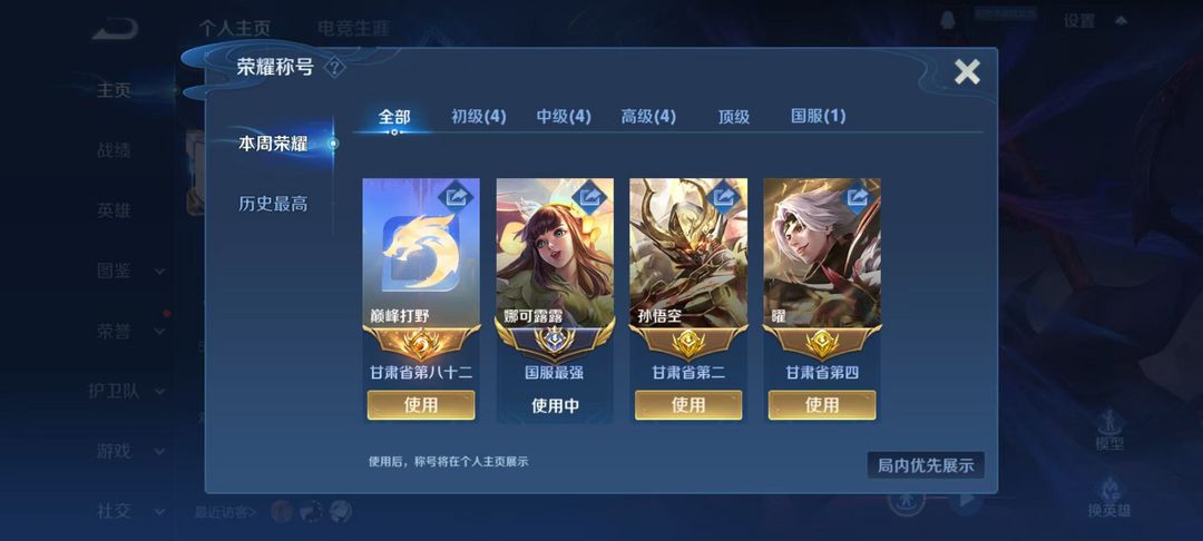 游戏区服:王者荣耀-QQ安卓-QQ账号 -手Q354区-雁帐美酒