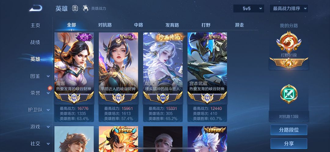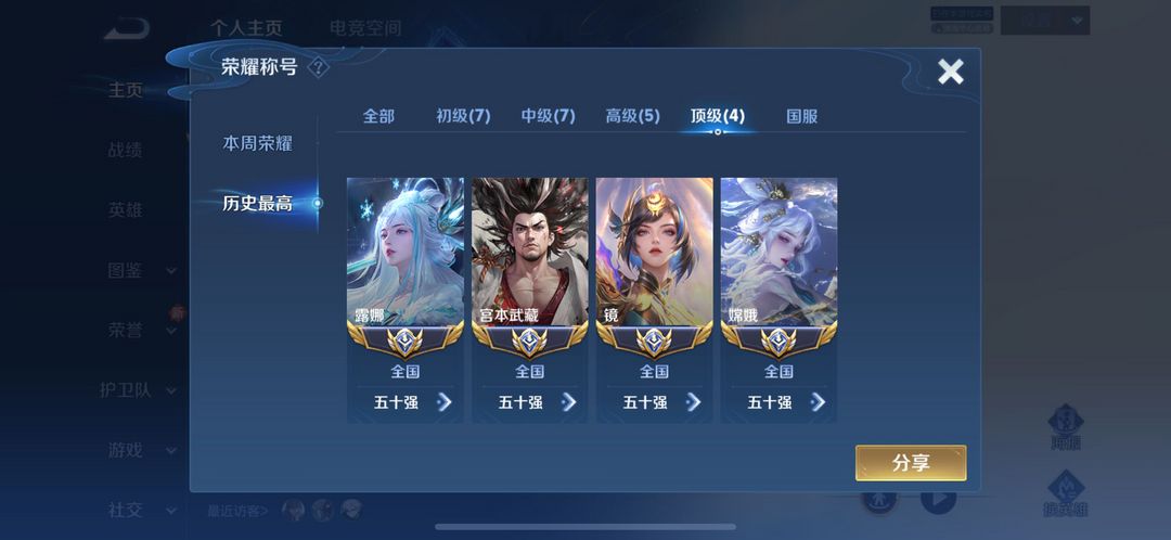 81段打野*百星印记*巅峰头像框主页魔方*在榜省标露娜宫本暃镜*历史四小国禁巅峰可排