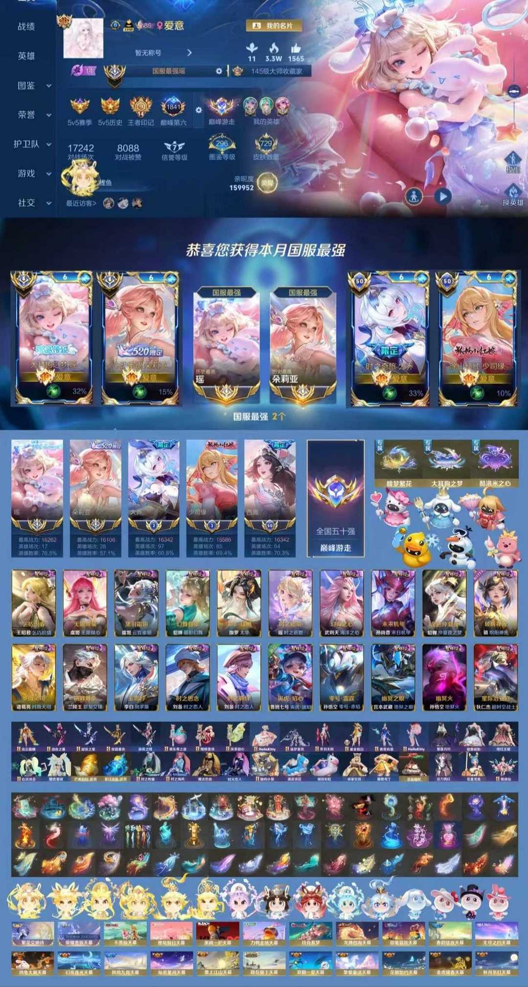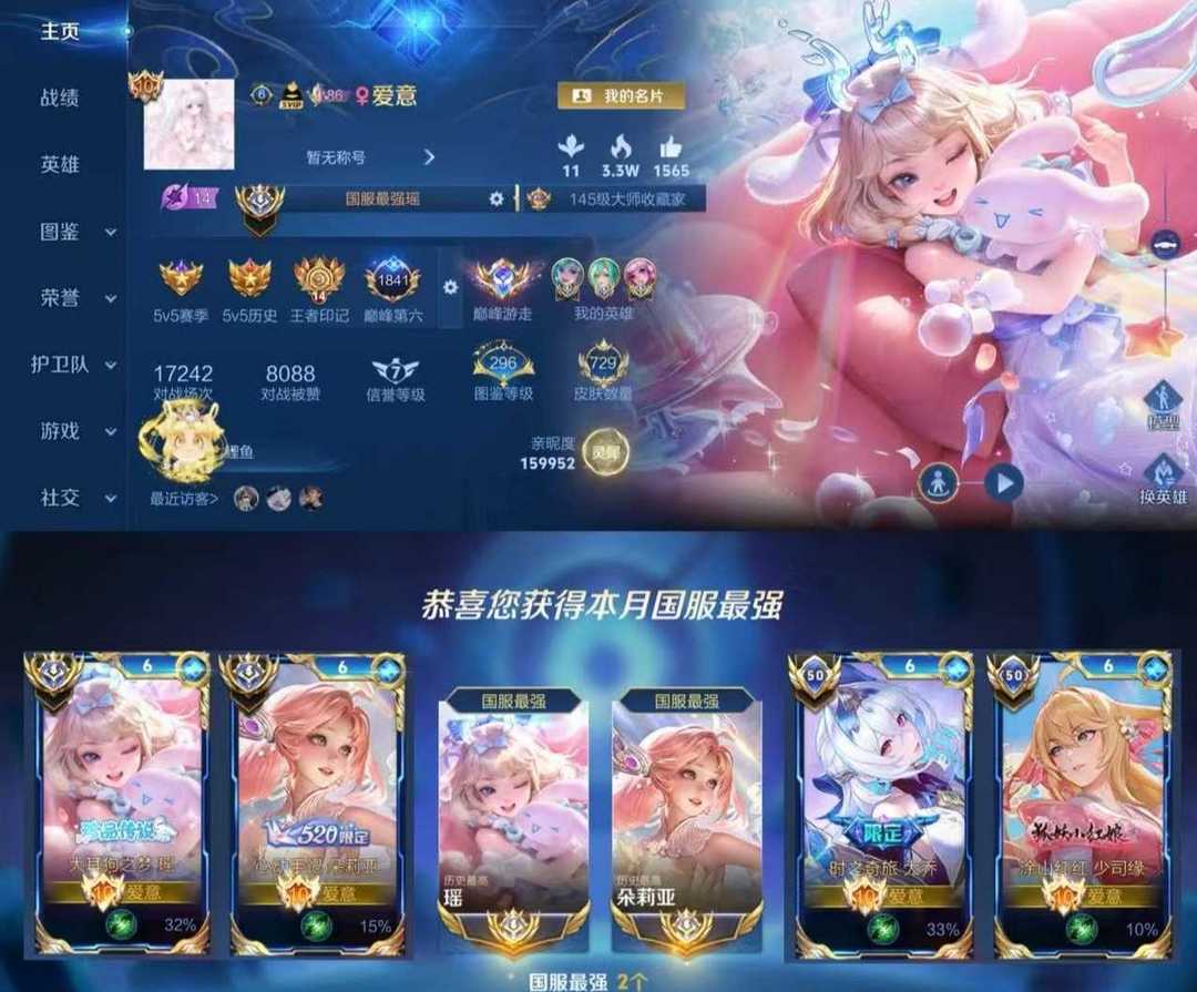 10月双在榜大国服瑶多利亚定榜双国一/巅峰万强全国第六女号禁巅峰/历史9国服软辅满隐藏金色灵宝满按键