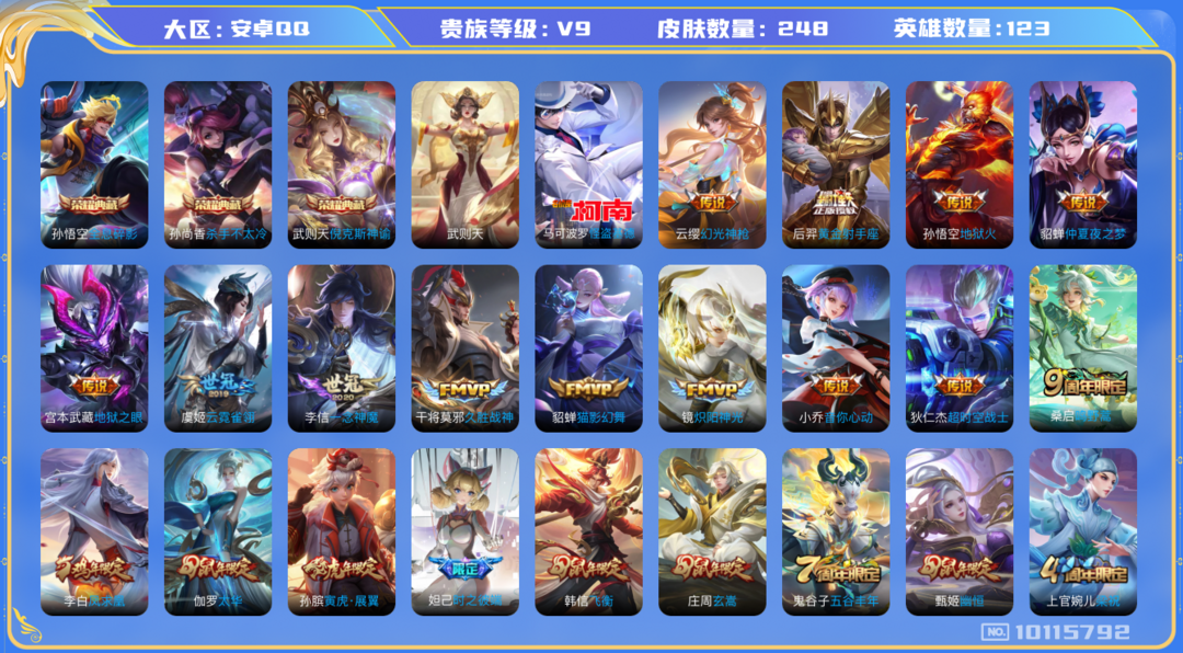 包天便宜✨不禁言 国服露娜魔方亮 3典藏 1珍品 21传说 男号 贵族等级: V9 英雄数
