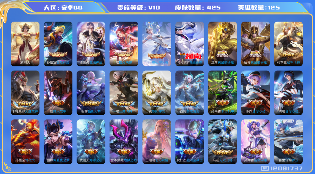 装备描述:v10 4典藏1珍品53传说 百段中路 小魔方 大国标奕星1.8w 大国标海月1.5w 大国标沈梦溪1.6w 数字国 5 小国标西施1.6w 小国标王昭君1.6w 小国标不知火舞1.7w 小国标干将莫邪1.5w 小国标诸葛亮1.4w 小国标上官婉儿1.4w 小国标周瑜1w怪盗基德 传说皮: 黄金狮子座,黄金射手座,冠军飞将,云鹰飞将,绛天战甲,猫影幻舞,久胜战神,炽阳神光,末日机甲-孙尚香,地狱火,仲夏夜之梦,音你心动-小乔,海洋之心,地狱之眼,音你心动-周瑜,乞巧织情,游龙清影,超时空战士-狄仁杰,无双飞将,音你闪耀,碎云,画中仙,妄想奇谈,永恒水手月亮,小动物乐团,霜月吟,艾琳觅芳踪,落雪白狼,玄雷天君,幻光神枪,千劫归真,续相思 限定皮: 冰锋战神,李小龙,祈雪灵祝,梁祝,时雨天司,武圣,烈魂,辉光之辰,天魔缭乱,神威,蜜橘之夏,永曜之星,时之彼端,飞衡,太华,青春决赛季,冰霜恋舞曲,逐梦之星,逐梦之影,神奇女侠,天狼绘梦者,凤求凰,白虎志,瑞麟志,朱雀志,凤凰于飞,梅西,至尊宝,默契交锋-兰陵王,武陵仙君,大圣娶亲,圣诞老人,匿光追影者,女儿国国王,寅虎·心曲,补天,深海之息,