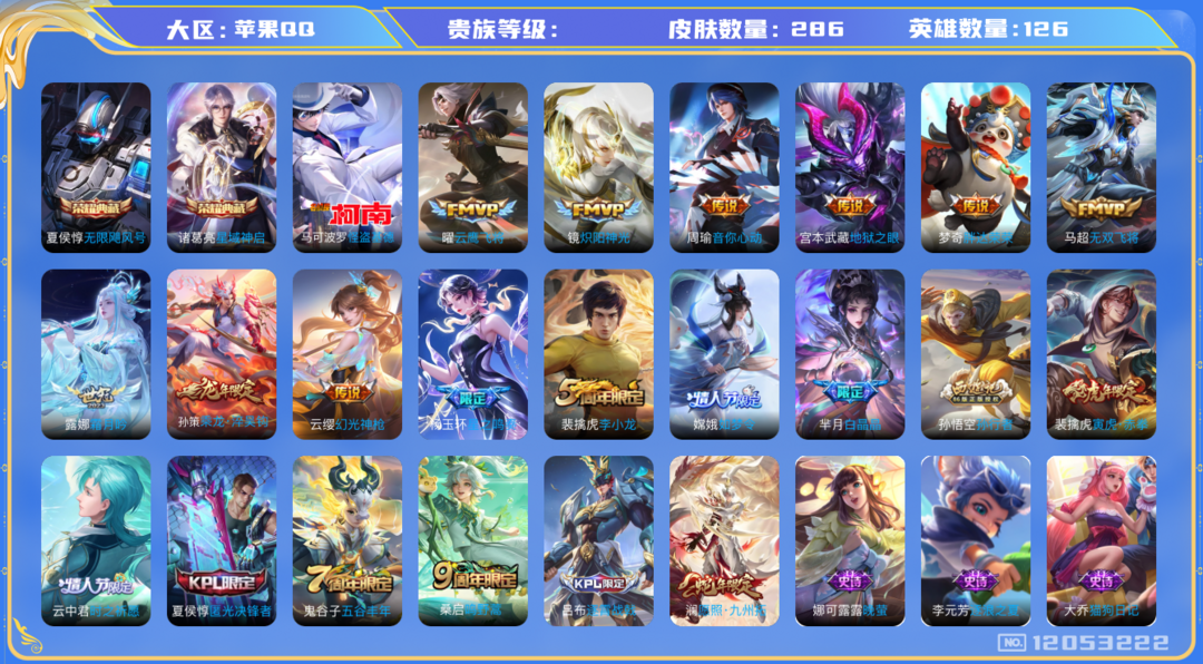 装备描述:英雄:马超(马超 无双飞将,马超 幸存者,区标);少司缘(少司缘 灵卦秘语);大乔(大乔 守护之力,大乔 猫狗日记,大乔 伊势巫女);裴擒虎(裴擒虎 李小龙,裴擒虎 寅虎·赤拳,裴擒虎 擒涛扼浪,裴擒虎 街头旋风);诸葛亮(诸葛亮 星域神启,诸葛亮 掌控之力,诸葛亮 星航指挥官);宫本武藏(宫本武藏 地狱之眼,宫本武藏 未来纪元,宫本武藏 万象初新,宫本武藏 鬼剑武藏);杨戬(杨戬 次元傲视,杨戬 潮玩骑兵,杨戬 埃及法老);暃(暃 碧珀绯影,暃 星界游侠);大司命(大司命 东方月初,大司命 暗都幽影);杨玉环(杨玉环 星之鸣奏,杨玉环 银翎春语,杨玉环 霓裳曲);苏烈(苏烈 爱与和平,苏烈 坚韧之力);百里玄策(百里玄策 威尼斯狂欢,百里玄策 超元猎域,百里玄策 原初追逐者,百里玄策 热力回旋);海月(海月 幻泉雾影);元流之子(法师);韩信(韩信 教廷特使,韩信 街头霸王);张飞(张飞 五福同心,张飞 乱世虎臣);影(影 魅影绮裳);云中君(云中君 云械蓝图,云中君 荷鲁斯之眼,云中君 时之祈愿);澜(澜 愿照·九州拓,澜 赏金猎手,澜 孤猎);廉颇(廉颇 地狱岩魂,廉颇 功夫炙烤