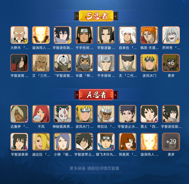 装备描述:面麻✨21S43A✨卑留呼✨永恒佐助✨黄猿✨半藏✨红夜之刃✨忍战大野木✨外星人✨天道超✨三代艾✨无