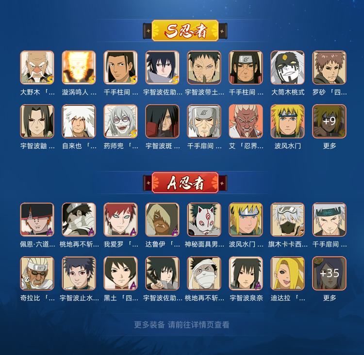 装备描述:22S 45A 209忍者 宇智波止水「新春限定」/桃地再不斩「漂泊武士」/佩恩·六道 「漂泊浪客」/波风水门「新春限定」/神秘面具男 「红夜之刃」/宇智波斑 「秽土转生·解」/波风水门「秽土转生」/千手柱间 「木叶创立」/漩涡鸣人 「九喇嘛连结」/宇智波带土「忍界大战」/宇智波佐助 「永恒万花筒」/大筒木桃式