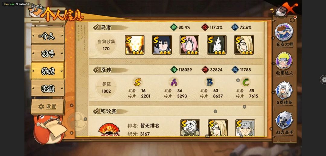 限制: 租号3次及以上 |装备描述:16S❤36A❤1133W❤九喇嘛鸣人❤永恒佐助❤创立柱间❤白面具❤红面具❤桃式博人❤木桃式❤