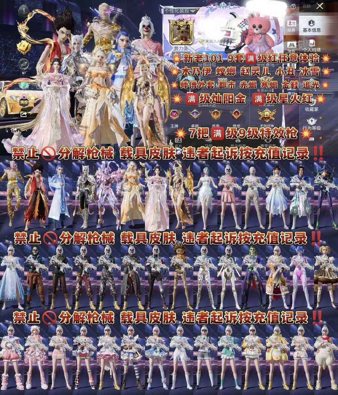 限制: 租号20次及以上 | 撤单率<60%才可租用此帐号装备描述:恶意撤单秒挤号拉黑,毁号,涉及毁坏虚拟财产罪及计算机安全罪,请文明游戏素质游戏,让我们共建美好租号平台 ,感受良好游戏体验! 注意事项: A.游戏过程中请不要恶意挂机或者不文明发言 B.恶意挂机、顶号等行为将被拉黑无法再次下单 C.进入游戏后中途请勿退出登陆,否则无法再次上号 D.部分账号由于异地登录可能会出现密码错误提示,通常再尝试5-6次后可上号 喜欢本账号请点 ☆收藏☆ 方便下次租用,谢谢