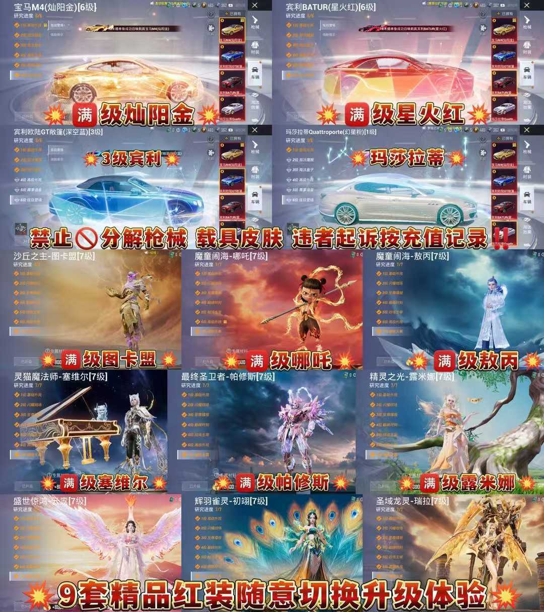 顶氪号✨9红装满级哪吒敖丙图卡盟全素材龙师傅老101✨满级宝马宾利✨7把满级9级枪灵猫星梦金蛇幽冥